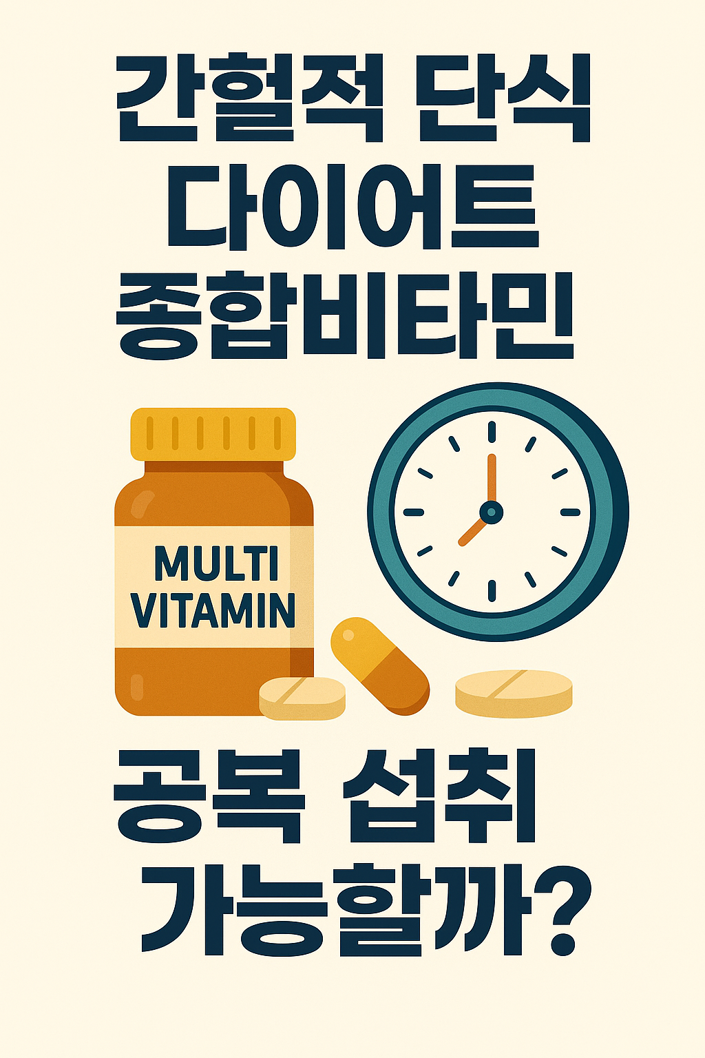 최근 몇 년 사이 간헐적 단식이 전 세계적으로 인기를 얻으면서 체중 감량뿐만 아니라 인슐린 감수성 개선 대사 건강 증진 등의 효과로 주목받고 있습니다. 하지만 식사 시간 외 모든 시간을 단식 상태로 보내는 간헐적 단식은 장점 못지않게 영양 불균형이나 피로감 탈모 생리불순과 같은 부작용을 초래할 수 있어 주의가 필요합니다. 특히 하루 섭취 칼로리가 제한되다 보면 자연스럽게 비타민과 미네랄이 부족해질 수 있으며 이러한 결핍을 방지하기 위한 종합비타민의 필요성이 강조되고 있습니다. 하지만 간헐적 단식은 공복 시간이 길기 때문에 종합비타민을 언제 어떻게 섭취해야 하는지에 대한 고민이 많습니다. 이 글에서는 간헐적 단식 중 종합비타민의 필요성과 공복 섭취 가능성 그리고 섭취 시 주의할 점을 구체적으로 설명합니다.