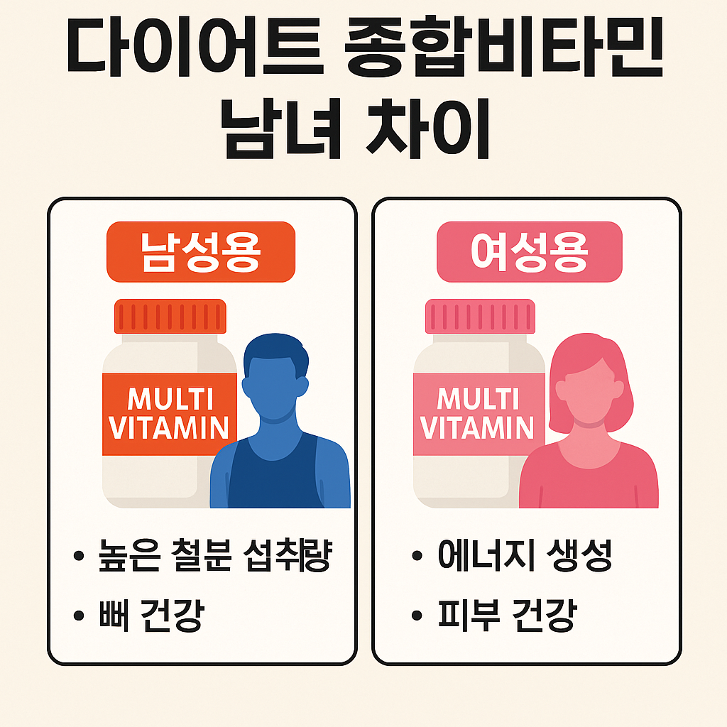 다이어트를 할 때 종합비타민을 함께 복용하면 영양소 결핍을 막고 체력 유지와 면역력 강화에 도움을 받을 수 있습니다. 하지만 시중에 판매되는 종합비타민 제품을 살펴보면 남성용과 여성용으로 구분되어 있는 경우가 많습니다. 이러한 구분은 단순한 마케팅 전략이 아니라 남성과 여성의 생리적 차이와 신체 조건에 따라 필요한 영양소가 다르기 때문에 이루어진 것입니다. 특히 다이어트 중에는 일반적인 상황보다 특정 영양소의 요구량이 더 높아지기 때문에 성별에 맞는 제품을 선택하는 것이 중요합니다. 이 글에서는 남성과 여성의 신체적 요구에 따른 종합비타민 성분 차이와 다이어트 상황에서 어떤 성분이 더 필요한지를 중심으로 남성용과 여성용 종합비타민의 차이를 자세히 설명합니다.