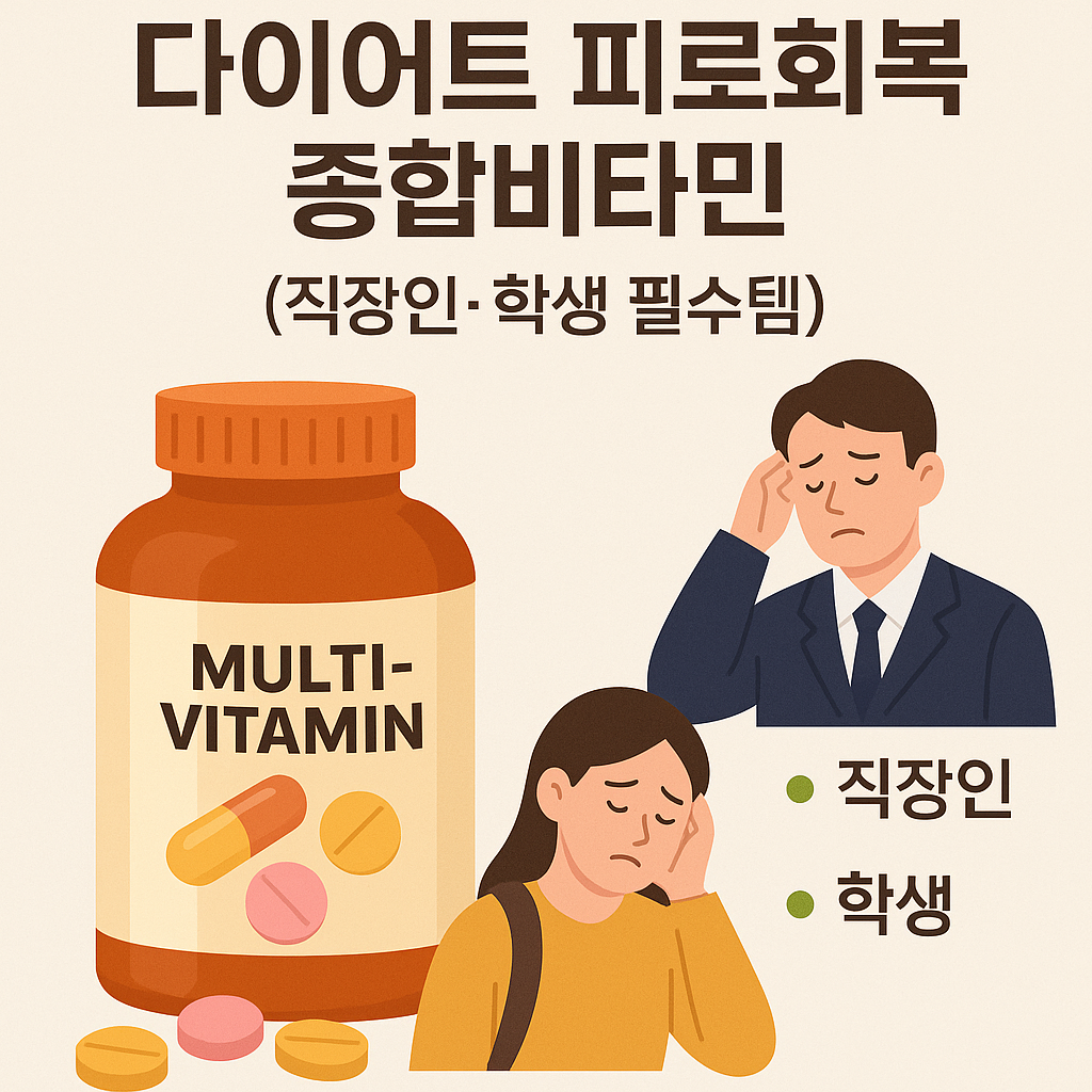 다이어트를 하면서 체중 감량에는 성공했지만 몸이 쉽게 피곤해지고 집중력이 떨어진다면 피로회복에 필요한 영양소가 부족한 상태일 수 있습니다. 특히 직장인이나 학생처럼 바쁜 일상 속에서 다이어트를 병행하는 경우 식사량이 줄고 영양 불균형이 쉽게 발생하기 때문에 만성 피로에 시달리기 쉽습니다. 이런 상황에서 종합비타민은 체중 감량 중에도 체내 에너지 균형을 유지하고 신경계 안정 면역력 유지까지 도와주는 필수템으로 주목받고 있습니다. 이 글에서는 다이어트로 인한 피로감을 효과적으로 개선할 수 있는 종합비타민의 핵심 성분과 직장인 학생 등 실사용자에게 적합한 선택 기준을 중심으로 자세히 설명합니다.